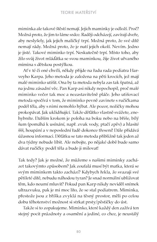 Kniha Teorie mateřství se zabývá otázkou péče o miminko od narození po období, kde se dítko samo (přirozeně) začíná od matky oddalovat. Dozvíte se, proč nemohou miminka sama usnout, proč je pro ně důležitý tělesný kontakt a co jim způsobuje vytrvalý pláč.