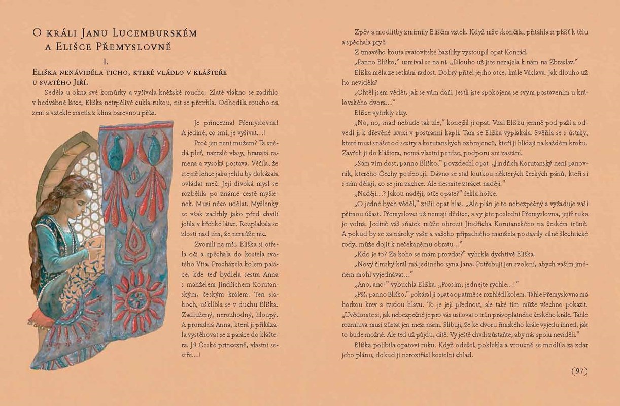 Devět historických příběhů přibližuje život a vládu českých panovníků, jako byl kníže Oldřich nebo Břetislav, Vladislav I., král Přemysl Otakar II., Václav II., Jan Lucemburský či Karel IV., ale také sv. Vojtěch nebo sv. Anežka Česká. Vyprávění představuje velikány naší historie jako živoucí a nezaměnitelné osobnosti, které stejně palčivě jako my prožívaly svá vítězství a prohry, lásku, nenávist i pochyby. Bohatě ilustrovaná kniha přináší nejen výjimečný čtenářský zážitek, ale je i skvělým doplňkem školního učiva.