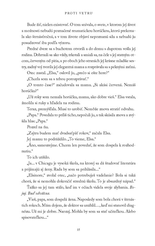 Proti vetru je strhujúci román, ktorý nám pripomína časy veľkej hospodárskej krízy a ľudí, ktorí ju prežili – tvrdú realitu, ktorá rozdelila národ a nútila ľudí bojovať o prežitie. Je to svedectvo o nádeji, odolnosti a sile ľudského ducha prežiť navzdory nepriazni osudu. Nezmazateľný portrét Ameriky a amerického sna videný očami nezlomnej ženy, ktorej odvaha a obeta definuje celé generáciu.