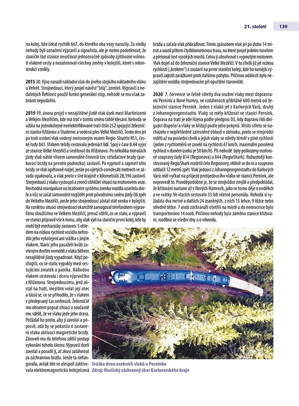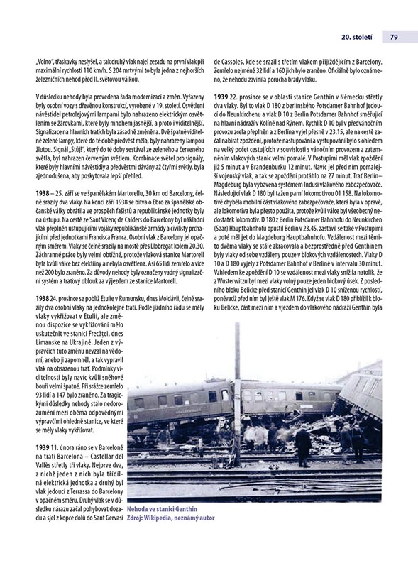 Nehody a tragédie, ať už zapříčiněné selháním lidského faktoru, techniky či neuvěřitelnou shodou okolností, bohužel doprovázejí každý druh dopravy. Tato jedinečná publikace mapuje železniční nehody u nás i ve světě a popisuje vývoj systémů řízení a zabezpečení železnice od roku 1825 až do současnosti. Jednotlivé kapitoly zahrnují vždy dvacetileté období a jsou opět doprovázeny nádhernými ilustracemi malíře Bohuslava Fultnera. Při popisu jednotlivých železničních nehod autoři rozebírají všechny faktory a okolnosti, které k nehodě vedly a poukazují rovněž na to, že řada chyb se neustále opakuje.