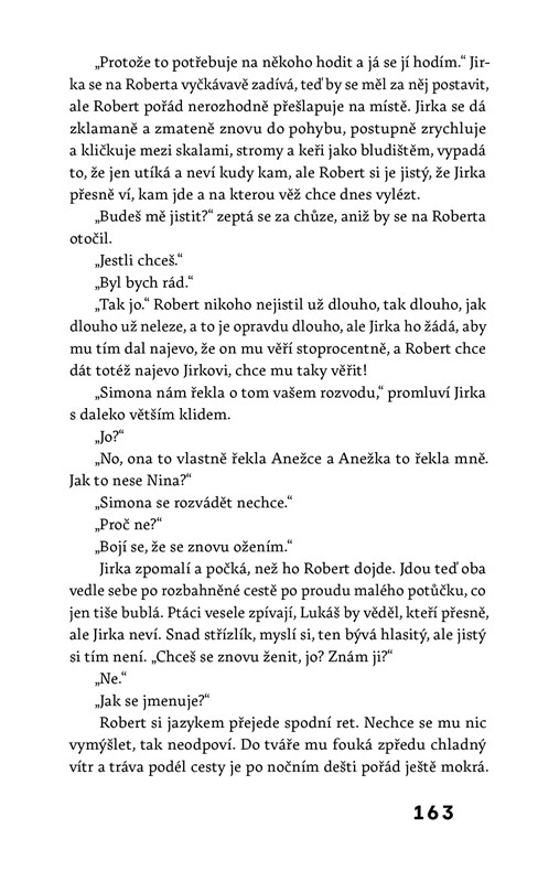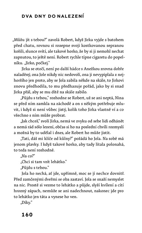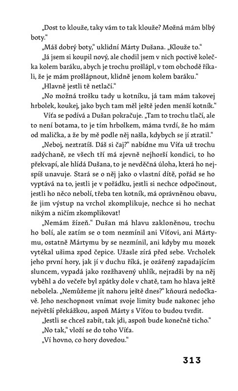 Napínavé vyprávění o lidech v horách a horách mezi nimi, které už nejde obejít, ale dá se z nich spadnout a dá se v nich ztratit. Stejně jako v té šílené spoustě tajemství, co si v sobě pečlivě střeží dospělí i děti. Budete se modlit, aby vám aspoň někdo z nich něco prozradil a aby si řekl o pomoc hlasitěji než úplným tichem. Všichni občas potřebujeme někoho, kdo nás zachrání. Nejprodávanější česká spisovatelka současnosti Radka Třeštíková vystavěla ve své sedmé knize příběh plný napětí, bolestných otázek a charakterově dokonale vykreslených postav. Parta kamarádů a jejich dospívajících dětí řeší v odlehlé chatě staré konflikty, nové vztahy a neodpuštěné křivdy. Autorka vás ve svém zatím nejrozsáhlejším románu vezme na dlouhou cestu za tím největším tajemstvím.