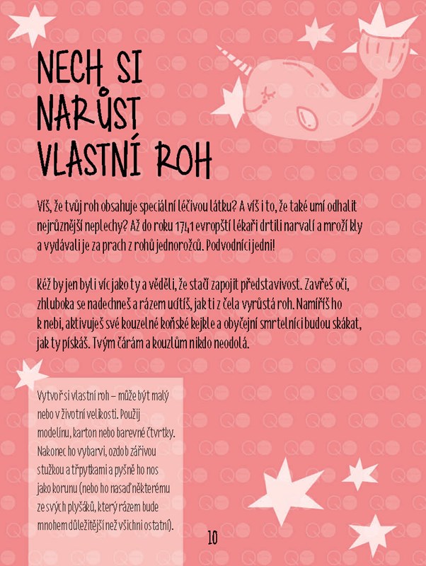 Uvnitř této knihy najdete podněty k psaní, seznamy úkolů a stránky na čmárání, které vás povzbudí k tomu, abyste prožívali svět jako jednorožec. Někdy totiž stačí jen ukázat svůj roh a nechat vaše kouzelné já zářit! Každá stránka nabízí jiný způsob, jak se vyjádřit, ať už výrobou právě jednorožčího rohu, nebo zaznamenáním kouzelných snů. Psaní deníků je relaxační činnost pro každého a tento rozmarný přístup k náročným životním situacím vám pomůže udržet si nadhled. Buďte jako jednorožec a přivítejte ve svém životě kouzlo.