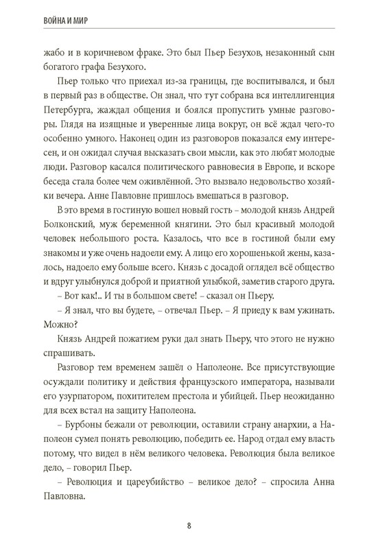 Román Vojna a mier sa radí medzi najvýznamnejšie diela nielen ruskej, ale aj svetovej literatúry. Popisuje Napoleonovo ťaženie do Ruska a obraz každodenného života v cárskom absolutizme z pohľadu piatich aristokratických rodín. O milostné vzplanutia a líčenie vojenských stretov nie je v diele núdze.