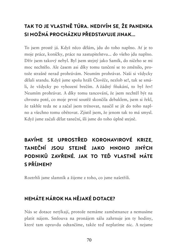 Tento otevřený rozhovor vám představí Zdeňka Chlopčíka nejen jako tanečního mistra a přísného porotce fenoménu StarDance, ale i jako milujícího tátu a manžela, galantního společníka, muže s vášní pro život a tanec či oblíbeného souseda a kamaráda. Jako člověka, který dělá i chyby a umí si je přiznat. Scházet nebude jeho profesionální pohled na současný tanec a nahlédnutí do zákulisí oblíbené televizní soutěže. Osobní zkušenost do knihy přidaly i Zdeňkovy tři děti a manželka Brigita.