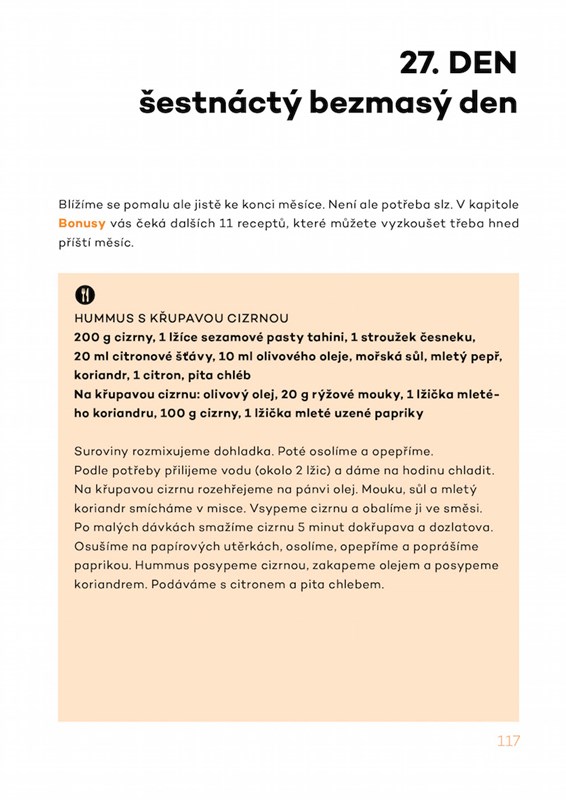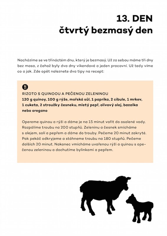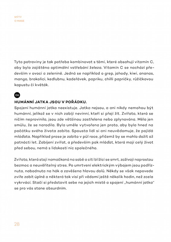 Je těžké učinit ono prvotní rozhodnutí vzdát se masa. Jako většina změn i tato s sebou přináší určitý strach, obavy i potíže, které se na bezmasé cestě mohou objevit. Tato prvotina podává ucelený přehled informací, které povedou čtenáře ke změně jak jeho celkového pohledu na ostatní živé tvory, tak i jeho naučených stravovacích návyků, které se jen slepě řídí tradicí a zvykem. Jedná se o 28denní plán, díky kterému v sobě člověk objeví společenskou odvahu a připraví se i na případné překážky. Kniha nabízí kromě bezmasých receptů i fakta a mýty o mase a spoustu užitečných tipů.