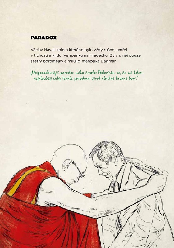 Ilustrovaný životopis Václava Havla přináší originální pohled na několik zásadních okamžiků jeho života. Byl chemickým laborantem, kulisákem, režisérem, spisovatelem, pedantským organizátorem, bohémem, extravagantním kuchařem, milujícím manželem i sobeckým nevěrníkem, morální autoritou i buřičem, vězněm i prezidentem. V každé své roli však vždy zůstával člověkem.