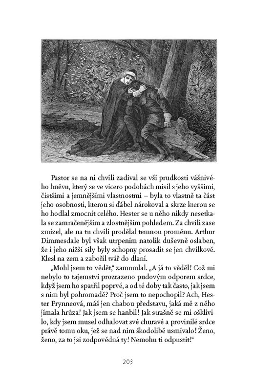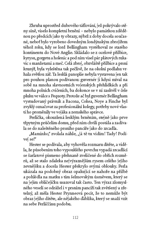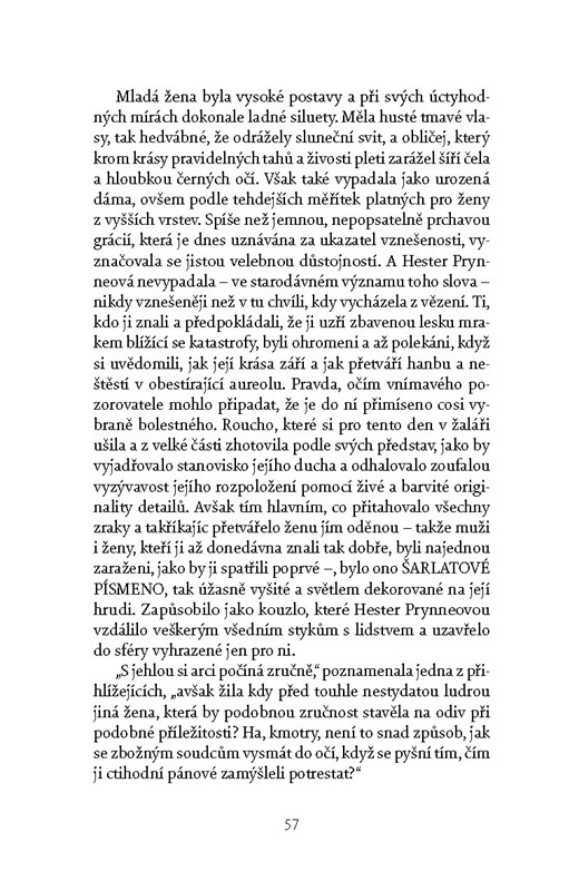 Klasický román americké literatury vypráví o ženě, která se prohřešila proti zákonům morálky tím, že odmítla prozradit otce svého nemanželského dítěte. Poutavý příběh o vině a trestu, diktovaný úzkoprsou puritánskou morálkou, je poznamenán temným ovzduším hrůzy, patosu a lítosti. Hrdinka příběhu Hester Prynneová je jedinou optimistickou postavou příběhu, která silou vůle a touhou po dobru odolává tíživému prostředí puritánského Bostonu. Hořký a krutý příběh je naplněn vírou v lidskou soudnost a statečnost, která jej přibližuje i dnešnímu čtenáři.