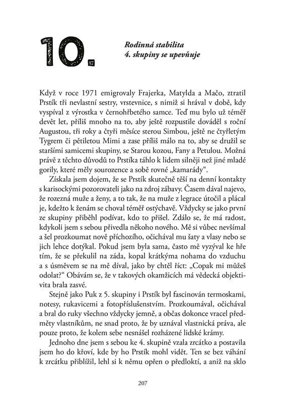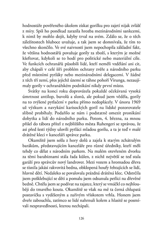 „Nikdy nepochopím, jak osiřelé mládě mohlo přežít věznění v té těsné kleci, tu ubohou výživu nebo infikované rány způsobené drátěnými pouty. Nějak v sobě našlo sílu vydržet ještě čtrnáct dní, než jsem se o něm dověděla. … Opatrně jsem vypáčila kryt ohrádky, neboť jsem nevěděla, jakou reakci mohu čekat. Bude mládě bázlivé, agresívní, anebo lhostejné? Byla jsem nadšená, když Koko rovnou z ohrádky vylezla, omámeně chodila mezi rostlinami a dotýkala se listů a stonků, jako by se chtěla přesvědčit, jsou-li opravdové. Pak zůstala stát, upřeně se na mě skoro minutu dívala, a nakonec mi velice váhavě vylezla na klín. Strašně se mi chtělo přivinout si ji, ale odolala jsem, abych nenarušila důvěru, kterou mohla poprvé vložit do člověka. Několik minut mi seděla Koko klidně na klíně, a pak odťapkala k dlouhé lavici pod okny, odkud byl výhled na nedaleké visocké stráně. S námahou se na lavici vydrápala a zadívala se na horu. Najednou začala vzlykat a po obličeji jí tekly skutečné slzy, což jsem u gorily nikdy předtím ani potom neviděla. Když se konečně setmělo, svinula se do hnízda z rostlin, které jsem jí udělala, a s tichým kňouráním usnula.“
