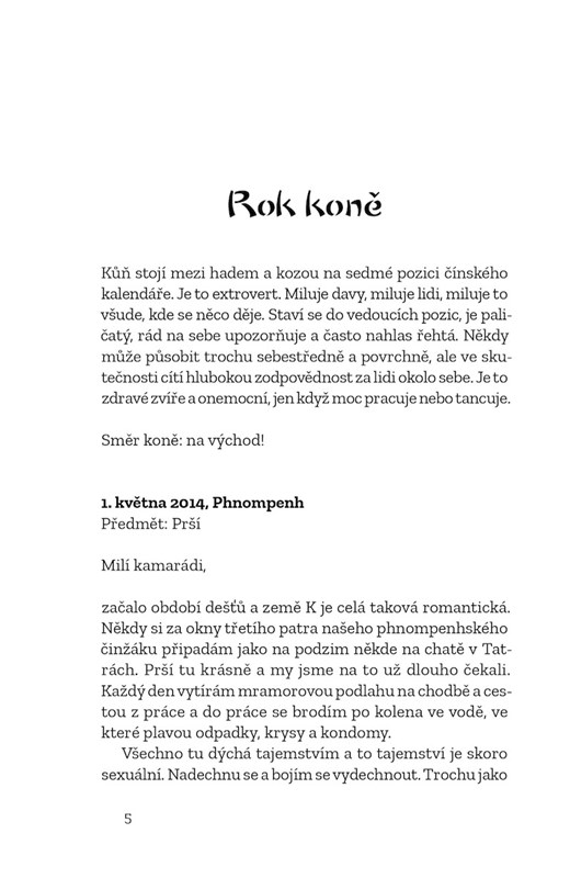 Sbírka cestopisných dopisů z let koně, kozy, opice, kohouta a psa. Autobiografická kniha nastiňuje politické, sociální i environmentální změny během pěti let strávených v jihovýchodní a jižní Asii.
