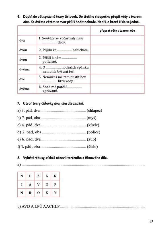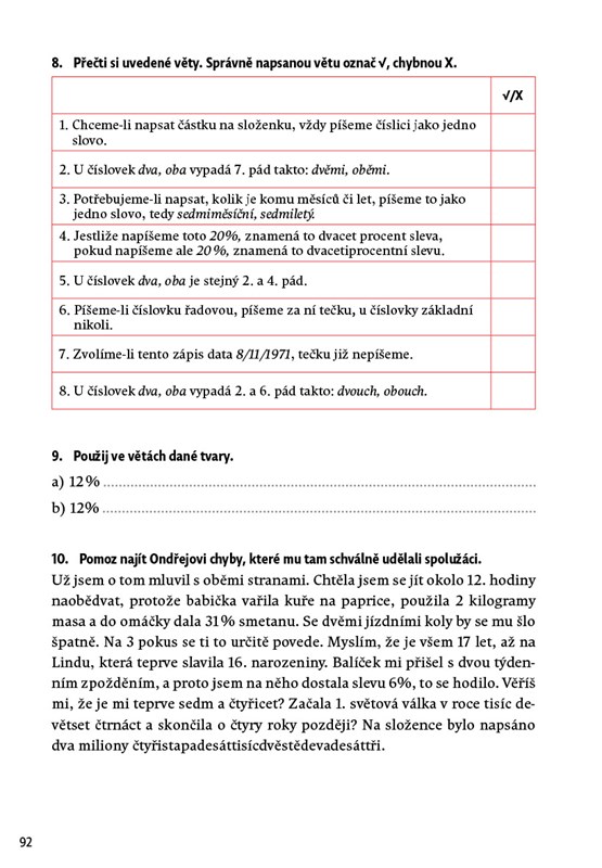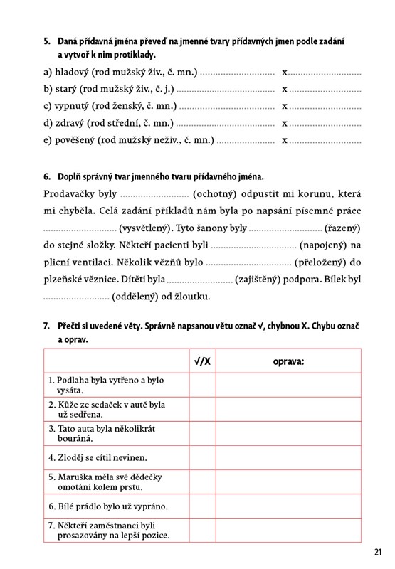 Potřebují si vaše děti zopakovat nebo procvičit pravopis přídavných jmen tvrdých, měkkých a přivlastňovacích, pravopis zájmen či číslovek? Nabídněte jim zábavnou cvičebnici plnou aktivit, úkolů, křížovek, rébusů a doplňovaček. Látka je řazena do kapitol podle jednotlivých slovních druhů. Děti mohou pracovat samostatně podle svého tempa a potřeb. Nechybí shrnující opakování a klíč správných řešení. Kniha je určena pro domácí procvičování, využít ji však mohou i učitelé jako doplňkový a rozšiřující materiál k výuce českého jazyka.
