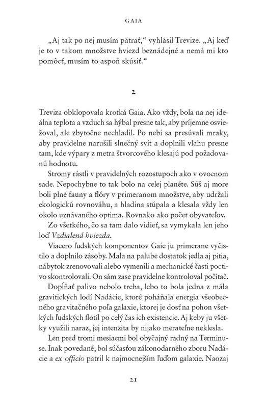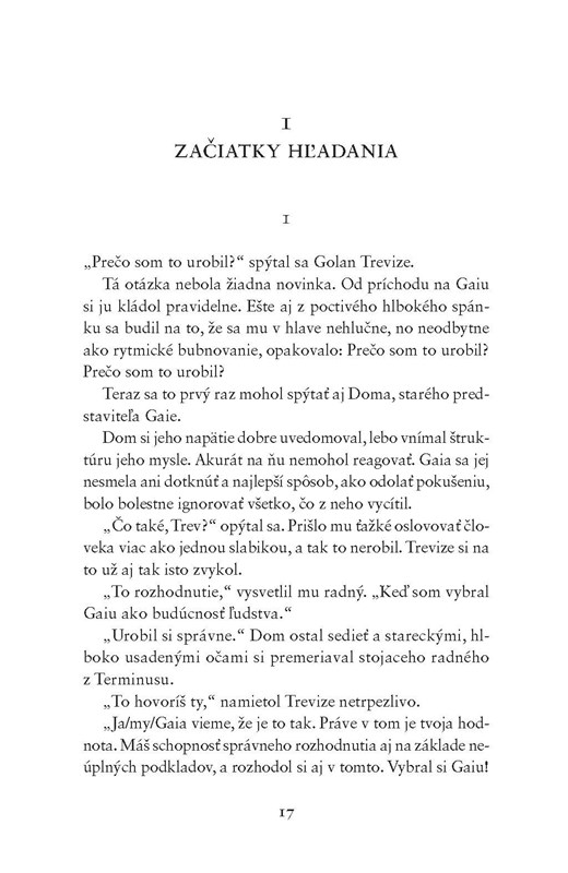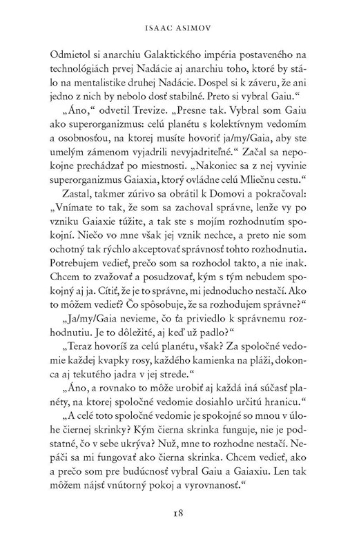 NadaÄŤnĂk Golan Trevize rozhodol v prospech Gaiaxie. Gaia je superorganizmus, planĂ©ta so zjednotenĂ˝m vedomĂm, kde kaĹľdá kvapka rosy, kaĹľdĂ˝ kamienok, kaĹľdá bytosĹĄ mĂ´Ĺľe hovoriĹĄ za všetkĂ˝ch – a cĂtiĹĄ za všetkĂ˝ch. Je to svet, kde je sĂşkromie nielen neĹľiaduce, ale aj nepochopiteÄľnĂ©.