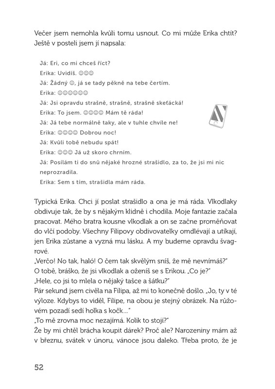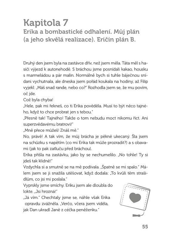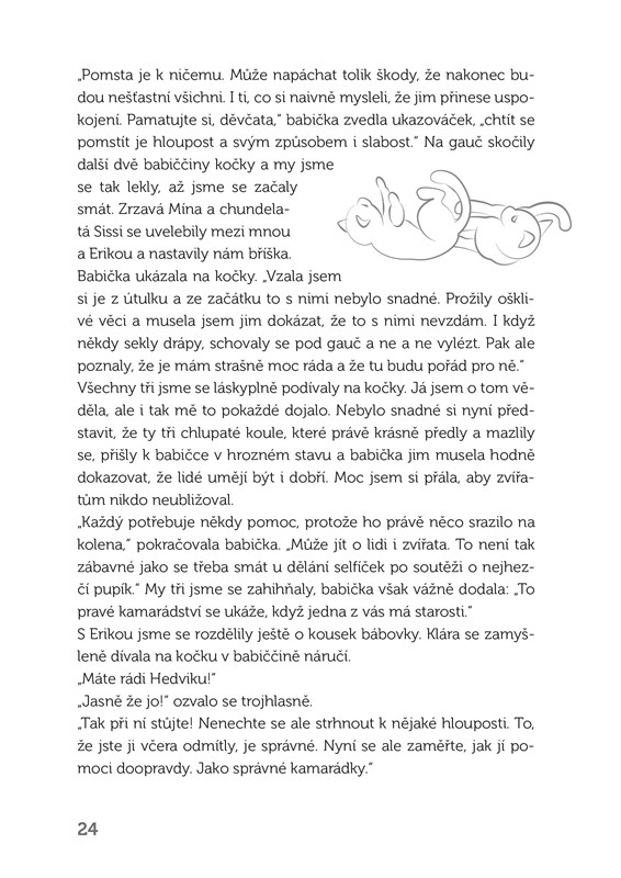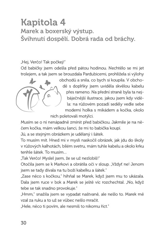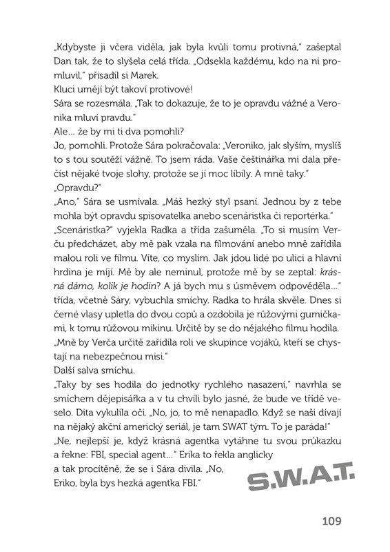 Kamarádky jsou pro Veroniku super důležitá věc. No a taky kočky, oblečení, ve kterém vám to sekne, srdíčka, růžové cokoli, prima rodina, a když vás kluci a ostatní ve třídě berou. Uhájit si svůj pohodový svět je ale někdy strašná dřina. Veronika musí vypátrat příčinu divného chování kamarádky Hedviky a z pořádné bryndy musí vytáhnout i Dana, kterému to sice strašně sluší (promiň, Marku), ale občas by potřeboval vytahat za uši.