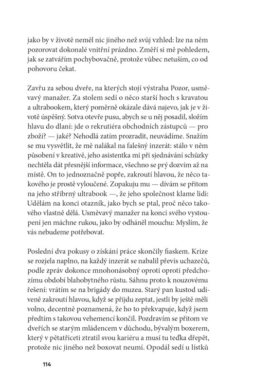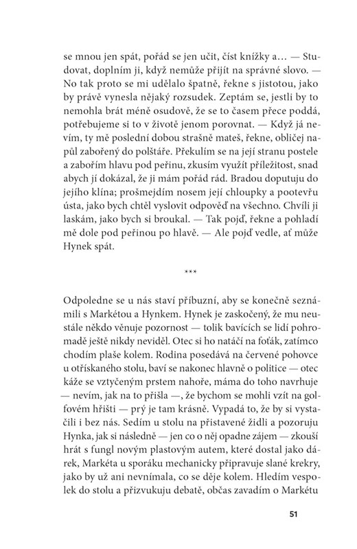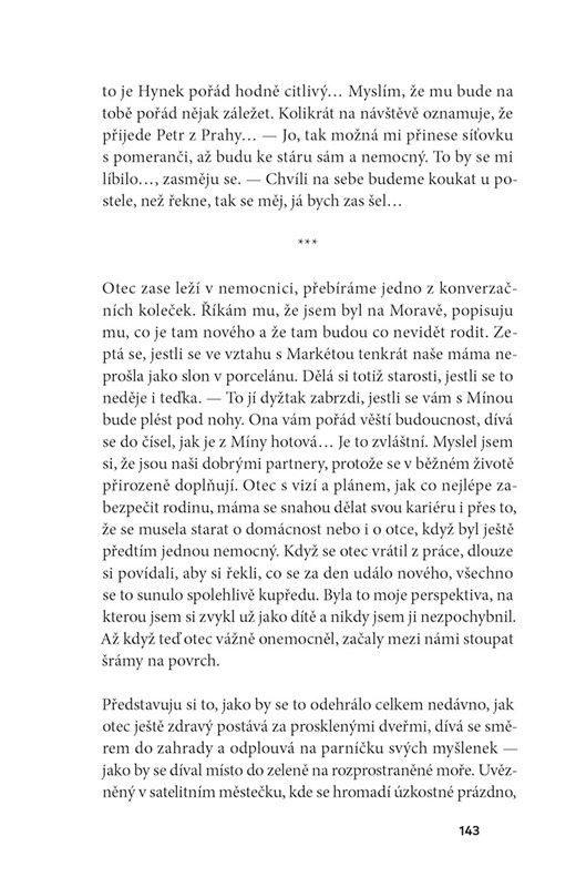 Postava romantika zastává paradoxní pozici. Pro jedny je idiotem, pro druhé osobností s ideály, které tak rádi následujeme. Takže když se Markéta s Petrem na stránkách knihy potkají, vypadá to banálně, na přímočarou love story. Romantika v pravý čas, chtělo by se říct, na prahu dospělosti. Jenže z toho vznikne román o otcovství, které autor chápe jako univerzální fenomén. Nedostatek nebo naopak přebytek otcovských figur rozhýbe děj svižně napsané příběhové mozaiky, která se dá číst jako pocta jednomu náhodnému setkání, nebo jako pokání plynoucí z nedostatku citové výchovy.