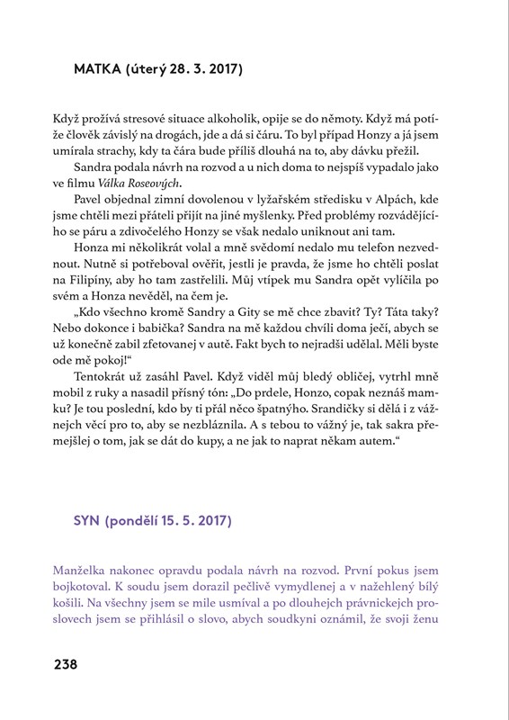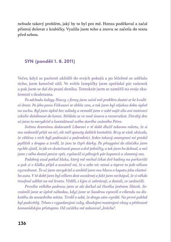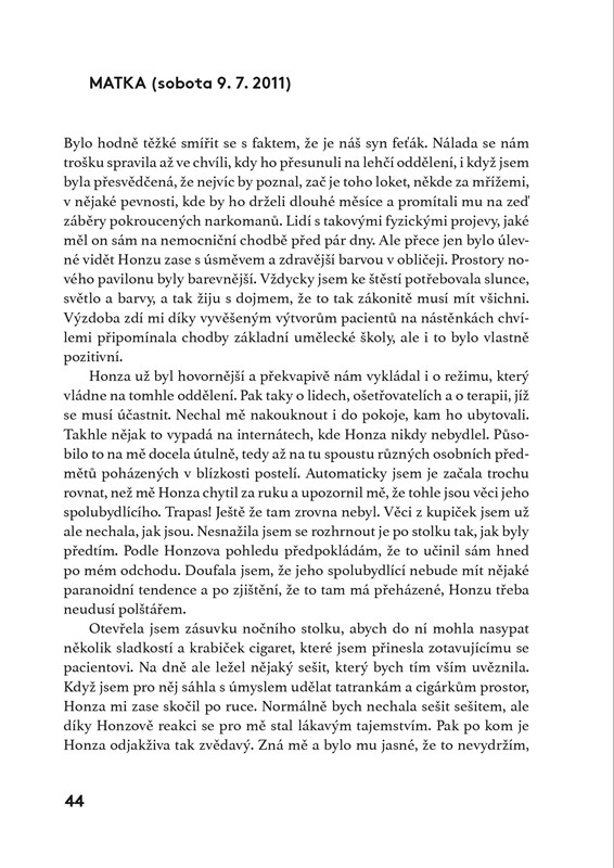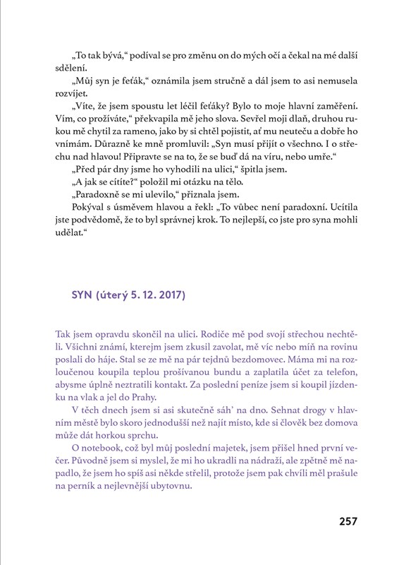 Mluvíte se svými dětmi o drogách? Myslíte si, že vás se tahle problematika týkat nemůže? Svoje zlatíčka jste přece vychovali dobře. Monika Kolářová si to taky myslela. Věřila, že její syn je bezproblémový kluk, kterému se v životě bude dařit. Až do chvíle, kdy se předávkoval neznámou látkou. Autentické zápisky matky a syna spolu se záznamy z terapeutických deníků ukazují nepříjemnou skutečnost v celé nahotě – závislost jednoho vždy zasáhne celou rodinu.