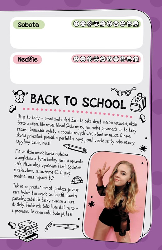 Už je to tady, první školní den! Zase tě čeká deset měsíců vstávání, úkolů, testů a učení. Ale neboj, škola nejsou jen povinnosti, ale taky kamarádi i zábava. A jestli jsi jako já, určitě tenhle diář využiješ, aby sis zaznamenala všechny super vzpomínky. Najdeš v něm taky moje fotky, příběhy i kvízy. Tak vyber ten nejvíc cool outfit, naostři pastelky, zabal si svačinu a hurá do školy. Tenhle rok bude stát za to – a provázet tě celou dobu budu já, Lea!