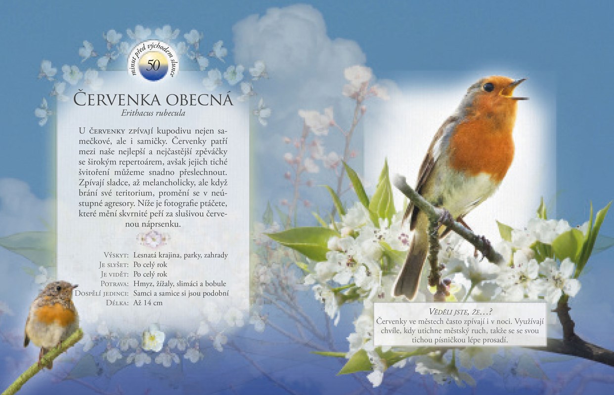 Věděli jste, že ptáci každé ráno zpívají v určitém neměnném pořadí a že koncem období hnízdění jsou slyšet většinou už jen nezadaní samečkové? S touto optimistickou knížkou se můžete probouzet za zvuků ptačího zpěvu, odpočítávat minuty do východu slunce a ještě se dozvědět, jací ptáci zrovna zpívají a co si zpěvem sdělují. Zvukové knížky z této edice jsou neotřelým oknem do živočišné říše pro malé i velké, kteří rádi pozorují přírodu a snaží se jí i naslouchat.
