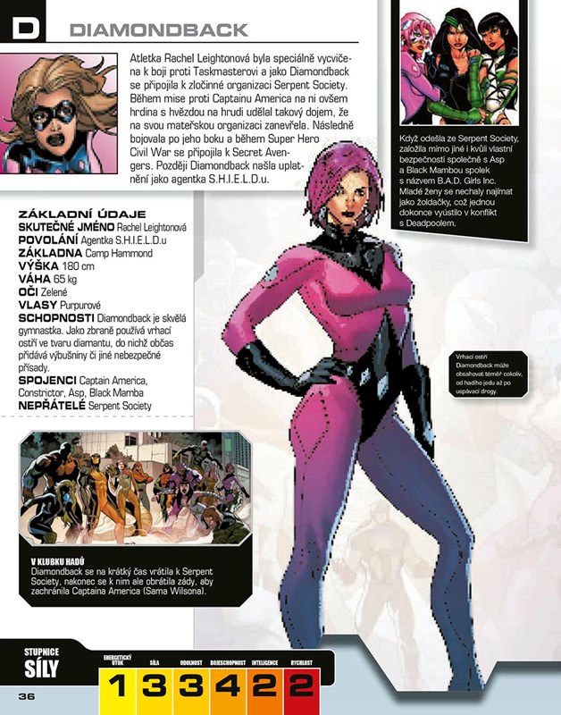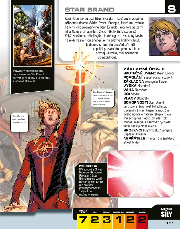 Každá strana obsahuje úžasné obrázky od nejvěhlasnějších kreslířů Marvelu a spoustu detailních informací o každé z postav. Dozvíte se o jejich historii, schopnostech, vztazích a také to,