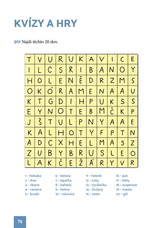 Dozvíte se důležitá fakta o nejrychlejší týmové hře na světě. Víte, jak se jmenují všechny prvky hokejové výstroje? Znáte všechna pravidla? A co víte o hokejových legendách a rekordmanech NHL nebo naší domácí soutěže? Seznamte se s úžasným příběhem hry, která učarovala generacím kluků i holek po celém světě, zjistěte odpovědi na tyto otázky a ještě mnohem víc! Jste experti? Dokažte to v nápaditých kvízech, které otestují vaše hokejové vědomosti!