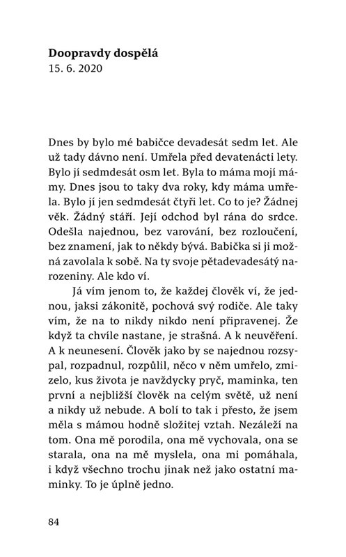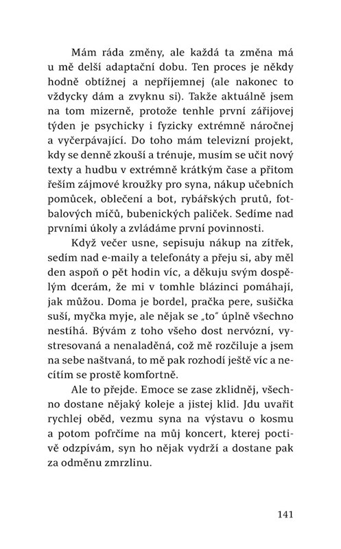 Jsem zpěvačka. A herečka. A spisovatelka. A máma. Normálně zpívám všude možně. Dostávám za to peníze. Je to moje povolání. Když nezpívám, starám se o syna. Mám taky dvě dcery, ale o ty už se starat nemusím. A všechny tři moje děti jsou moje nejvíc. Nejvíc, co jsem v životě dokázala. Jinak jsem úplně normální, obyčejnej člověk, kterej je momentálně úplně vykolejenej. Učím se vysadit z pracovního tempa, zpomalit a přehodnocovat věci. Stejně jako vy.