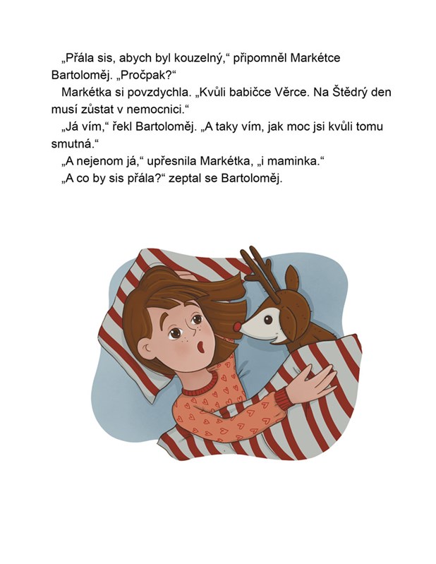 Vánoce jsou čas, kdy se u Markétky doma schází celé příbuzenstvo. Babička Věrka však bude muset letos zůstat na Štědrý den v nemocnici a Markétka má proto velkou starost. Jak Ježíšek babičku najde? Chodí tam vůbec? A nebude jí smutno?