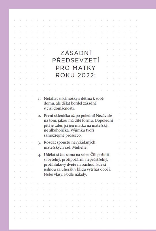 Mlíčko, odsávačky, plenky, prdíky, období vzdoru, puberta… Taky vám z toho už hrabe? Trio 3v1 dá vašemu životu ve stínu dětí nový rozměr. Matkou roku se můžete stát i vy – všechno, co pro to musíte udělat, je pořídit si tenhle diář. Hoďte se do pohody s pořádnou dávkou hlášek, fotek, tipů i autorských nálepek od novopečených matek 3v1. Svěřte děti a chlapa do péče své tchyně a užijte si volnou jízdu po celý rok 2022! A pokud zrovna neřešíte mami-mimi témata, nevadí, být nad věcí se hodí každé z nás. Nový rok zkrátka bude váš - za každou cenu, to si pište!
