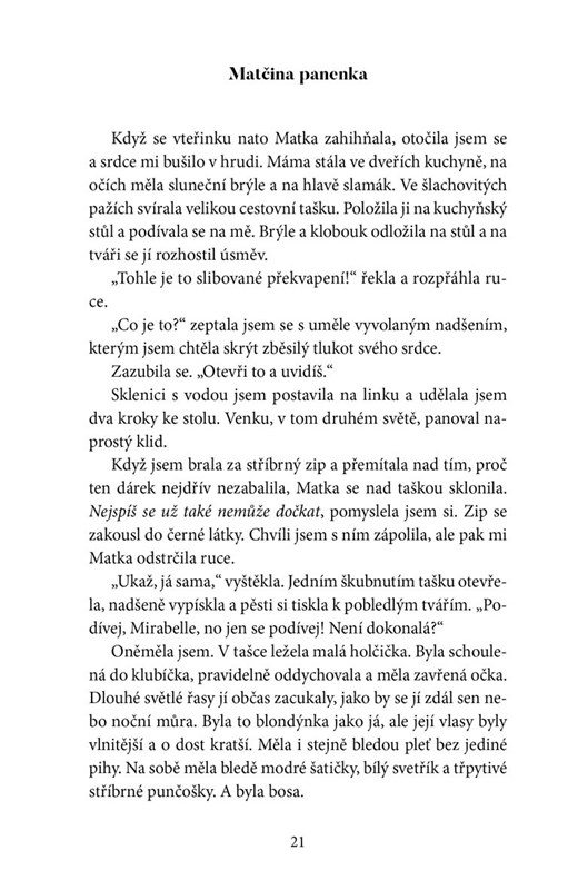 Mirabelle žije v domě se zabedněnými okny a zamčenými dveřmi. Nikdy se nepodívala ven, protože jí to Matka nedovolí. A ta přece všechno dělá pro její dobro. Miluje Mirabelle jako svoji panenku. A tak ji obléká do hezkých šatiček, maluje jí tvář a češe vlasy. Ke třináctým narozeninám jí dokonce přinese speciální dárek – mladší sestřičku Clarabelle, kterou zachránila z vnějšího světa.