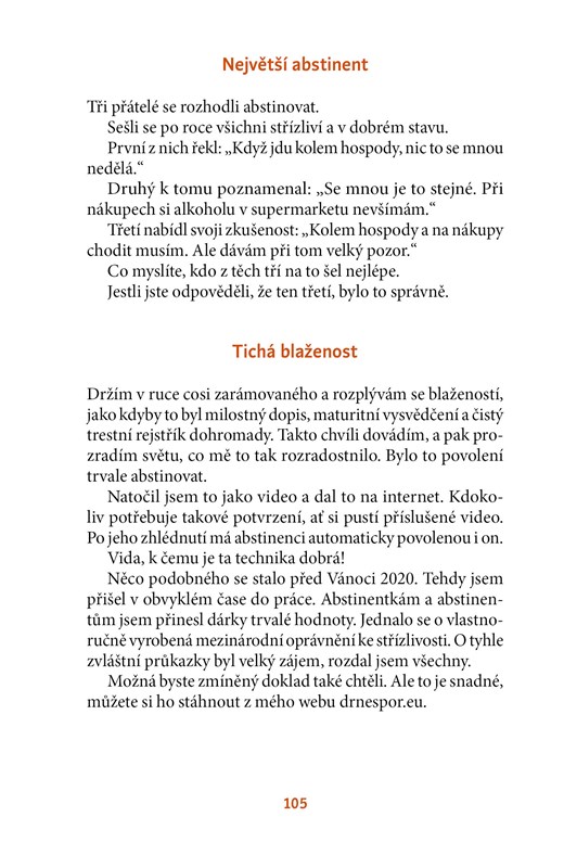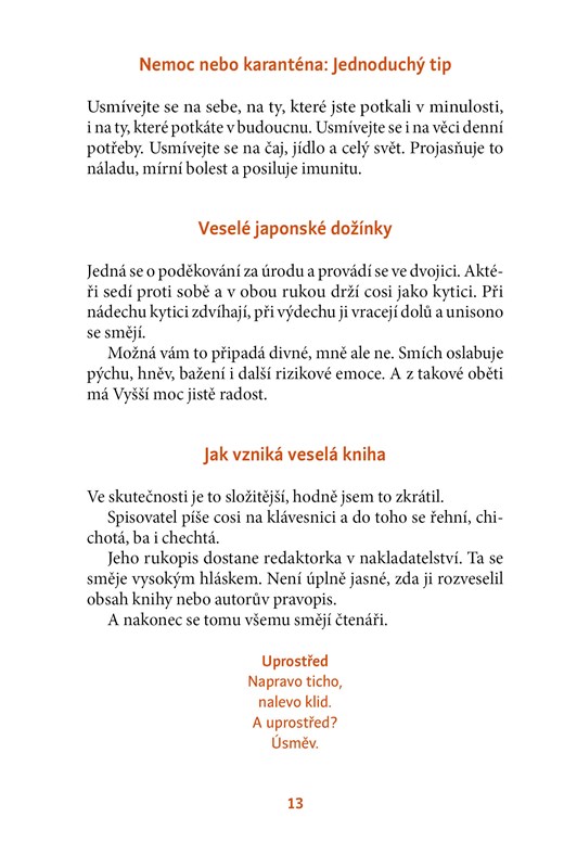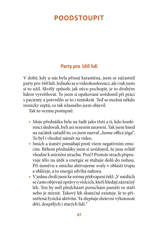 Známý psychiatr a specialista na léčbu návykových nemocí Karel Nešpor má jasno: s úsměvem jde všechno lépe. Ve sbírce odlehčených zamyšlení se s nadhledem věnuje různým tématům a hledá odpovědi na odvěké otázky života. Jak můžeme ovlivnit své zdraví pomocí pozitivního psychického naladění? A jak si udržet odstup i ve vážných situacích? Nejen to najdete v jeho úvahách, glosách, příbězích a nápadech podaných svižně a bez patosu. Kniha „Usmát se a poodstoupit“ vznikala během pandemie. Dr. Nešpor vycítil, že lidé potřebují něco pohodového, veselého a uklidňujícího. Tuto knihu není třeba číst najednou. Dá se otevřít kdekoliv, kousek přečíst a vrátit se k ní, když je čas a chuť. Kniha jistě přinese čtenářům radost a bude pro ně inspirací do klidnějšího života.