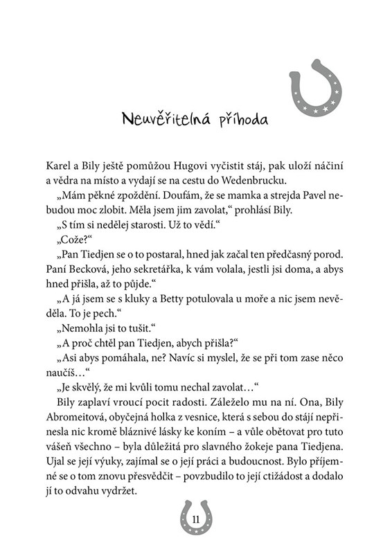 Bily už se nemůže dočkat prázdnin a volných dnů, které bude moci strávit v sedle. Ale než přijde léto, čeká na ni a na jejího věrného kamaráda, strakatého poníka Větrníka, ještě spousta výzev. Jejich pomoc bude potřebovat nejen pan Tiedjen, když se vážně zraní na závodech, ale také nemocný opuštěný poník, kterého objeví nedaleko Velkého Dvora.