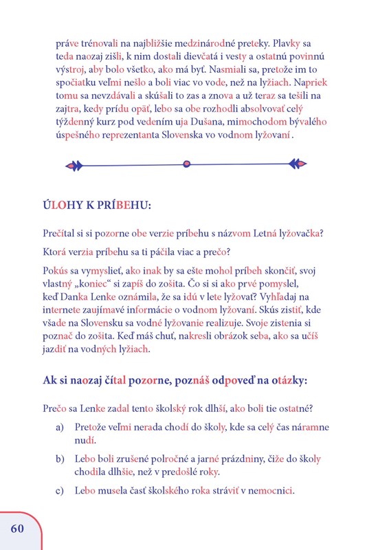 • Druhá časť knižky je tvorená príbehmi, ktorých hlavnými hrdinami sú deti. Každý príbeh má vždy dva konce – verziu A a verziu B. K obom verziám sú ďalej uvedené otázky a tiež rôzne úlohy nielen na overenie si porozumenia prečítaného deja, ale i rozvoj naratívnych schopností, sociálnych a emocionálnych kompetencií detí, ich kreativitu, ale taktiež na fixáciu v škole naučených základných gramatických pravidiel.