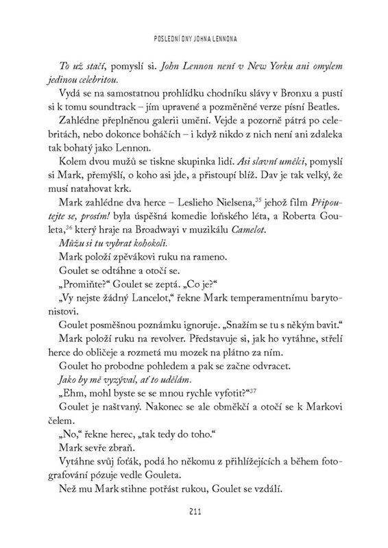 James Patterson, jeden z největších světových bestselleristů, neopakovatelným způsobem vypráví fascinující příběh dvou mužů, kteří se sešli v nesprávný čas na nesprávném místě. John Lennon se díky Beatles dostal až na vrchol slávy a splnil si tím svůj sen. „Byli jsme nejlepší kapela, jaká kdy existovala," prohlásil. „Nikdo nás nemohl zastavit!" Nikdo, kromě jednoho docela obyčejného muže z Texasu jménem Mark David Chapman. Ten kdysi považoval členy kapely za své idoly a bezmezně je obdivoval. Avšak s pocitem, že ho John Lennon zradil, se nakonec obrací proti nim. A tak se rozhodne, že už nebude dál jen nečinně přihlížet. Během léta 1980 John Lennon konečně po dlouhé době nahrává nové album. Nemůže se dočkat, až světu předvede, co dokázal. Stejný pocit naplňuje i Chapmana, který se vzdává práce v ostraze a nastupuje do letadla mířícího do New Yorku; zbraň i s náboji má bezpečně schovanou ve svém zavazadle.