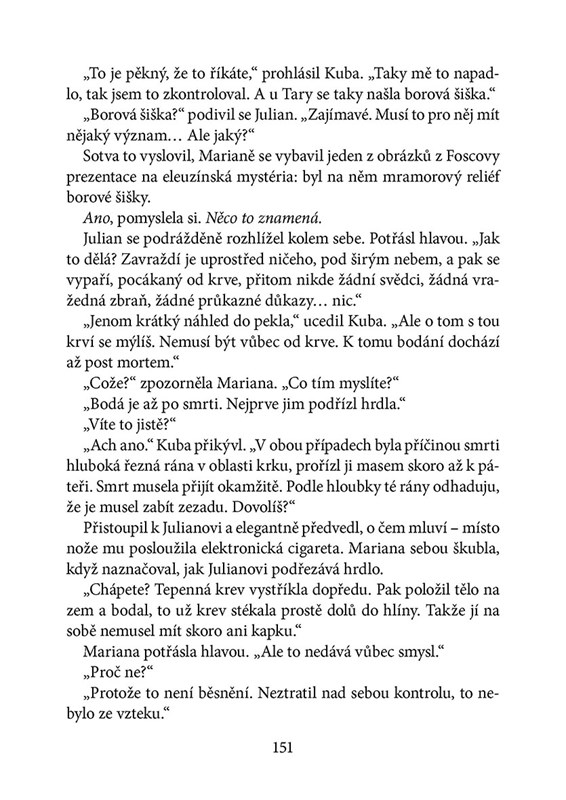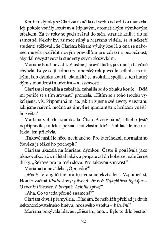 Edward Fosca je vrah. Mariana je o tom přesvědčená. Jenže pohledný a charismatický profesor řecké tragédie je na Cambridgeské univerzitě nedotknutelný. Studenti ho zbožňují, zejména členky tajného studentského spolku nazvaného Panny. A právě z jejich řad vzešla první oběť. Je vážně možné, že by se profesor zaměřil na jednu ze svých studentek? Když se objeví další tělo, Mariana se rozhodne Foscu zastavit – i kdyby ji to mělo stát její vlastní život.