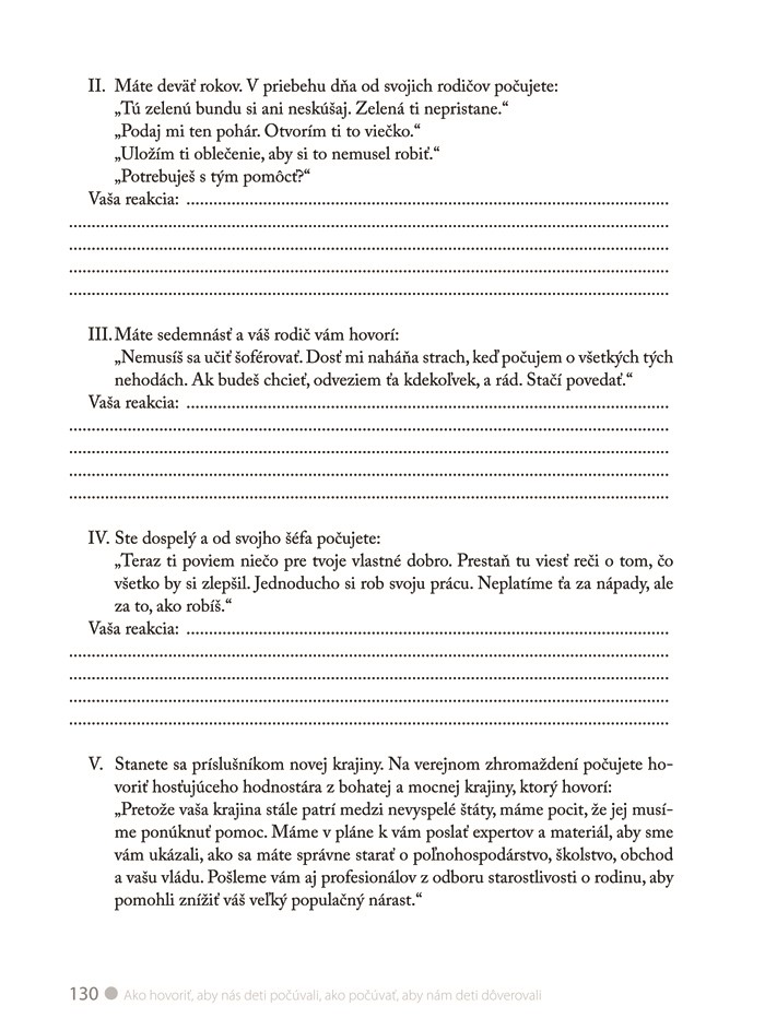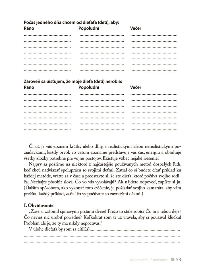 Svetový bestseller! Vynikajúca pomôcka pre komunikáciu rodičov s deťmi vychádzajúca z praxe skúsených autoriek – detských psychologičiek. Názov knihy doslova zodpovedá tomu, čo v knihe nájdete. Poskytuje návody krok za krokom na zlepšenie a posilnenie vzájomných vzťahov v rodine a porozumenia medzi rodičmi a deťmi. Vhodnou pomôckou sú kreslené ukážkové situácie s odporučeným priebehom dialógu.