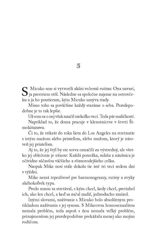 Z Japonska prichádza na návštevu Mikeova matka Micuko, no Mike sa zbalí a odcestuje do Osaky za svojím smrteľne chorým otcom, ktorého nevidel celé roky. Ben ostáva v byte sám s cudzou ženou, ktorá si udržiava odstup a spočiatku bez slov reorganizuje celú kuchyňu. Postupne však Ben a Micuko zistia, že jeden cez druhého nanovo spoznávajú Mikea, a jeho neprítomnosť ich spája. Ben si uvedomí, že možno práve zistil, čo od života chce, a vie, ako to získať. Potom sa však vráti Mike...