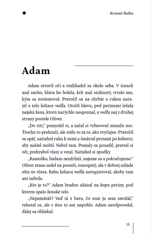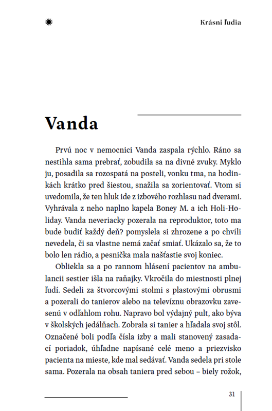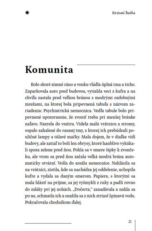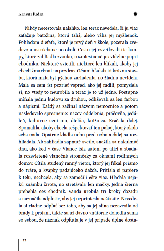 Autorkin debutový román Krásni ľudia je v dnešnej uponáhľanej dobe akýmsi zdvihnutým varovným prstom.
