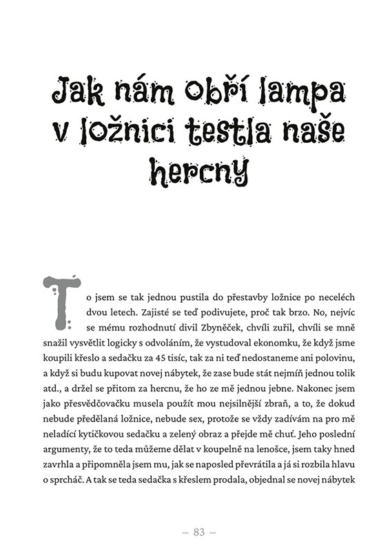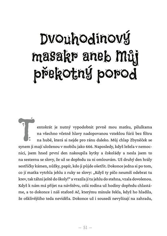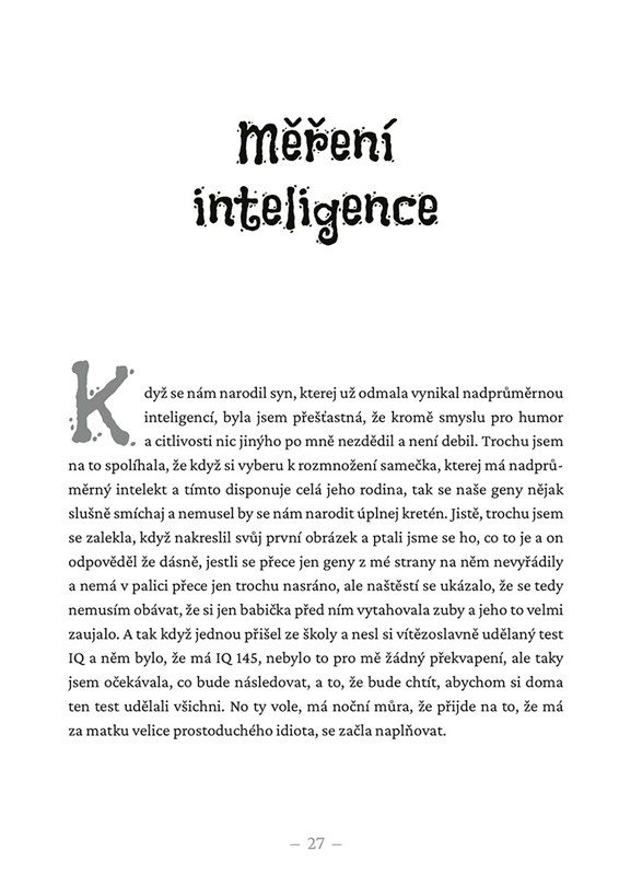 Že prej se má něco o sobě a o knize napsat i tady dozadu, údajně aby případní kupci (čtenáři) měli důvod si tuto srandobichlu kópit. Tak se teda pokusím. Pocházím a žiju v Brnisku, takže tímto i vysvětluju, že v knize píšu, jak mluvím. Hubu mám odmala pěkně prořízlou, filtrem na slušnou mluvu jsem nikdy nedisponovala, takže puritánům a sucharům bez smyslu pro humor nedoporučuju. Díky mé střelenosti a těžko zvladatelnýmu temperamentu se má rodina a kámošky rozhodně nenudí, a tak možná pobavím i vás.