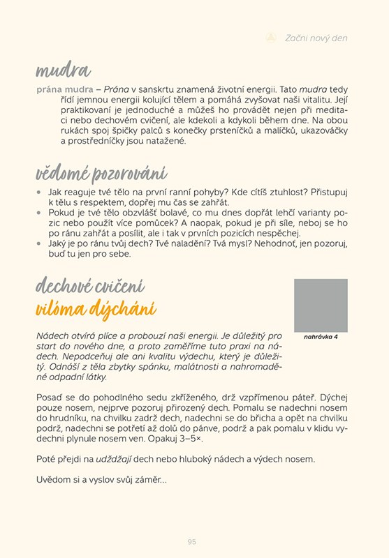 Tato kniha je určená všem, kdo chtějí na podložce poznat sami sebe, posunout se hlouběji ve vnímání svých potřeb či se naučit zacvičit si doma sami.