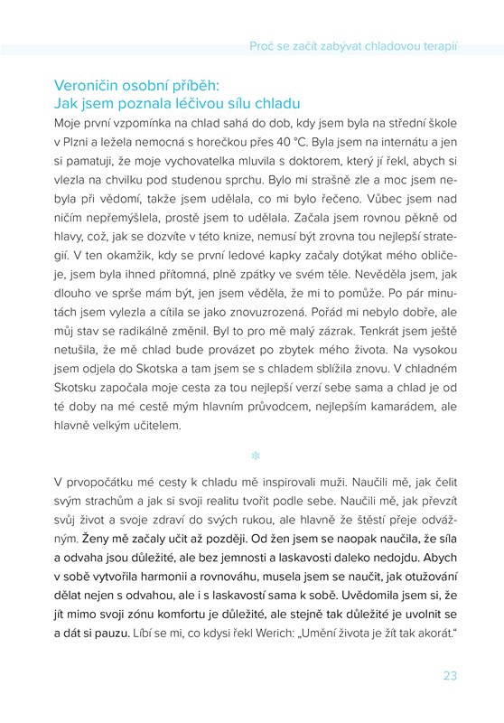 Knížka je o otužování a chladu - o jednom z nejblahodárnějších přátel našeho těla a mysli. Chlad je tu s námi, lidmi (homo sapiens) odpradávna. A díky tomu jsme si na chlad skvěle zvykli. Často si stačí dovolit v hlavě, aby se naše tělo přizpůsobilo a dovolit chladu, aby nám pomohl v nás budovat “nejlepší verzi sebe sama”.
