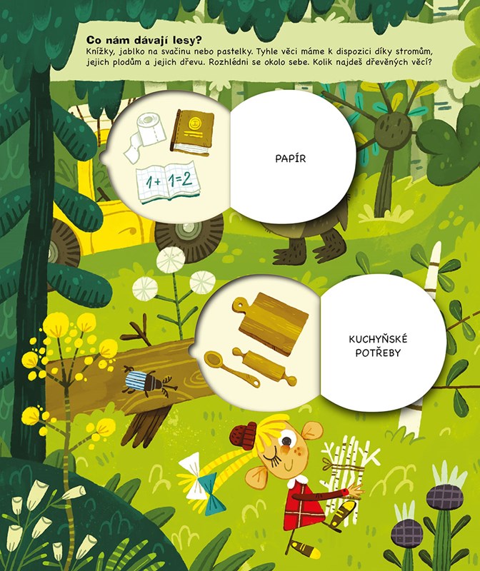 Napadlo tě někdy, odkud pochází věci kolem nás? Tužky sice nerostou na stromech a sušenky neposbíráš na poli, ale přesto mají původ v přírodě, stejně jako mnoho dalšího – nábytek ze dřeva, kovové příbory, včelí med nebo chleba. A my často ani nepřemýšlíme o tom, kolik práce dalo toto všechno vyrobit. Jak dlouho rostl strom, než se z něj stala židle, na které právě sedíš? Jak se z mléka od kravičky stala zmrzlina, která tě v létě ochladí? Tato knížka ti ukáže, z jakých materiálů jsou vyrobené věci z našeho každodenního života. Nakoukni pod odklápěcí okénka a objevuj, co všechno získáváme z přírody okolo nás.