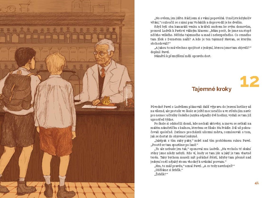 Ludva s Pavlem dál chodí do své milované Jezerní kotliny a nosí do města lékárníkovi vzácný šafrán. Občas však mají pocit, že je někdo sleduje. Při jedné z výprav objeví jeskyni a v ní něco, co otevře celou řadu otázek. Je možné, že by se mrtvý Dernet vrátil? Dobrodružný příběh v tradici Jaroslava Foglara.