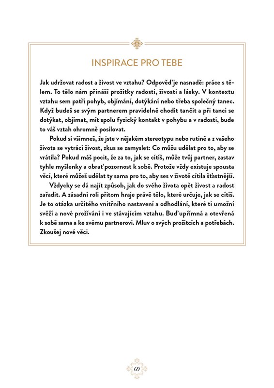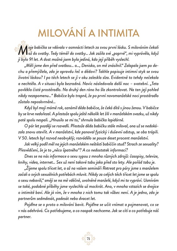 „Ani by mě nenapadlo, že po třiceti letech manželství, kde panoval chlad a odcizení, se můžeme milovat ještě víc než na začátku! Že naše sexualita bude tak živá a mnohem krásnější!“ Jsem nesmírně vděčná za to, že taková slova slýchám a čtu v mnoha různých obměnách od párů všech generací. Od párů, nad kterými psychologové a sexuologové zlomili hůl a radili jim, ať jdou raději od sebe. Od párů, které už neviděly jiné východisko, než rozvod…, ale láska jim nedala, aby nevyzkoušeli „ještě něco“.