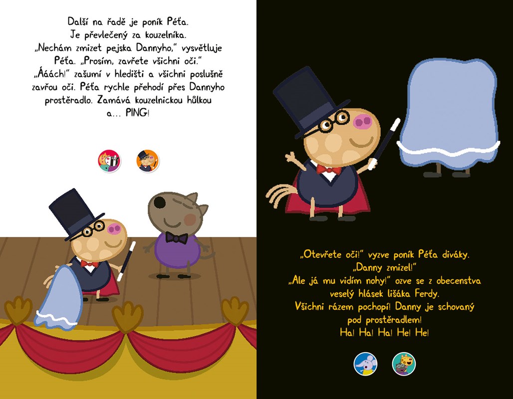 Někdo fouká bubliny, někdo hraje na hudební nástroj, jiný kouzlí… Ale jaký talent předvede Peppa? Vyzkoušej si všech 18 tlačítek s rozmanitými zvuky a zjisti, co se na velmi hlučné besídce přihodí. Při čtení zmáčkni vždy tlačítko podle obrázku dole na stránce a skvěle se bav!