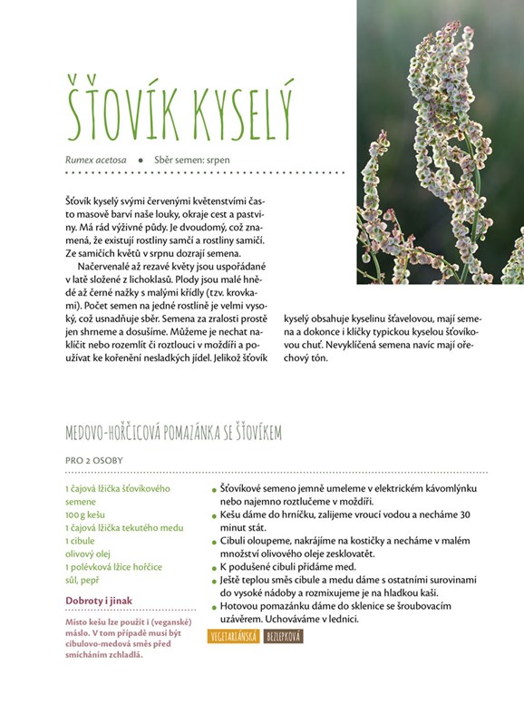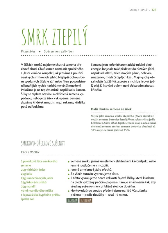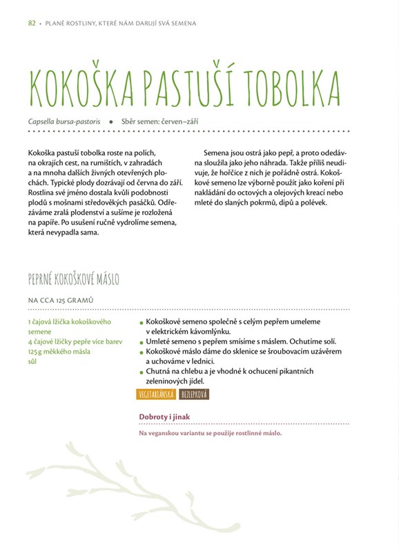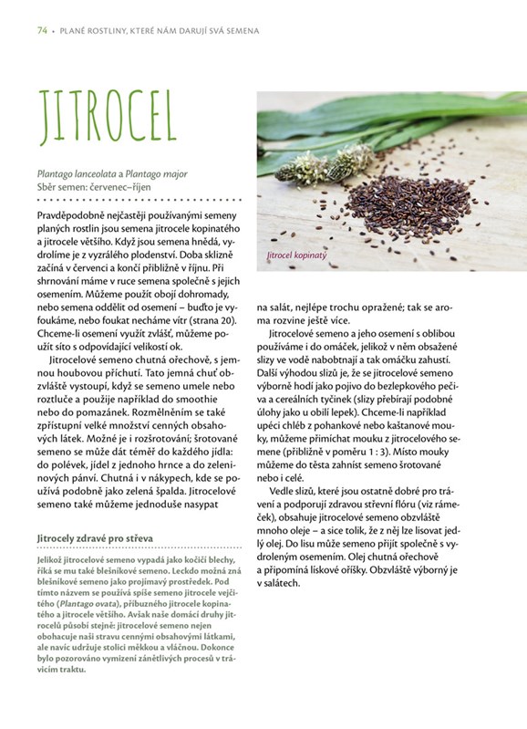 V této knize je uvedeno 44 portrétů planých bylin s využitelnými semeny, včetně údajů o stanovišti, době zralosti, sklizni a využití. Obzvláště nápaditých a vybraných je více než 50 receptů nasladko a naslano, jednoduchých i rafinovaných, zdravých a velmi chutných.
