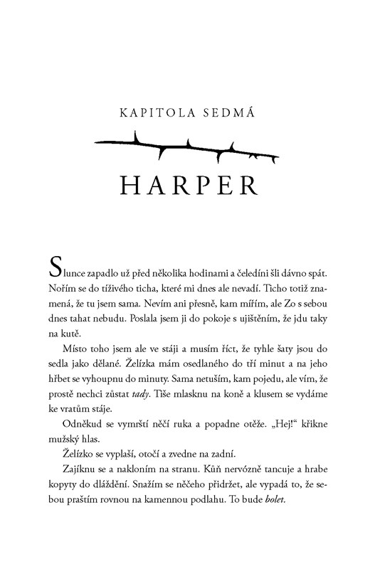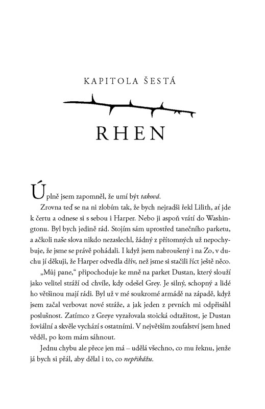 Uhlíkov se rychle rozpadá, na jedné straně stojí ti, kteří věří, že Rhen je právoplatný dědic, na druhé ti, kteří touží začít novou éru pod vedením Greye. Ten souhlasil, že počká dva měsíce, než na Uhlíkov zaútočí, a za tu dobu se Rhen od všech odvrátil - dokonce i od Harper, která se mu zoufale snaží pomoci najít cestu k míru.