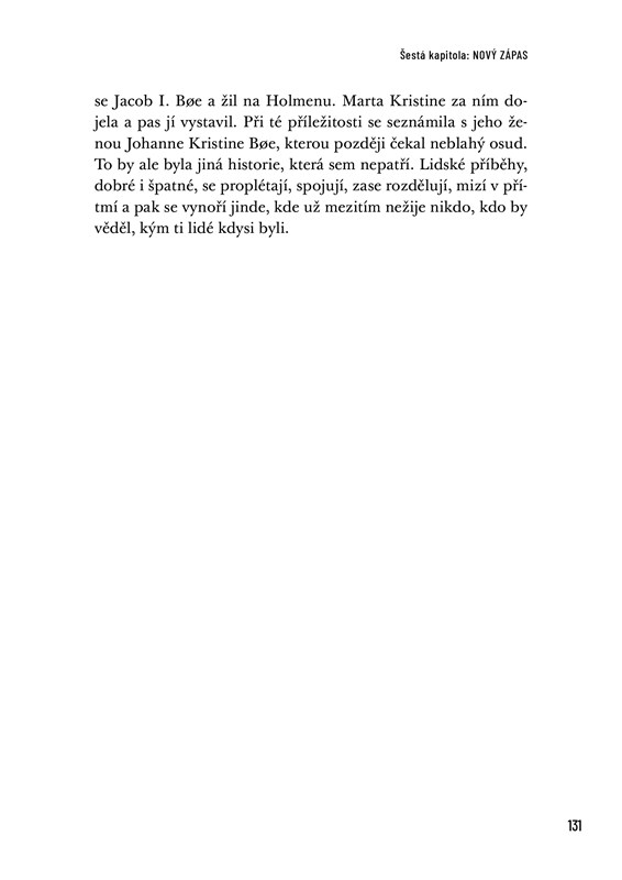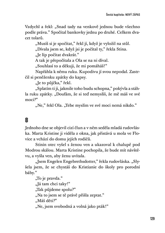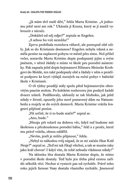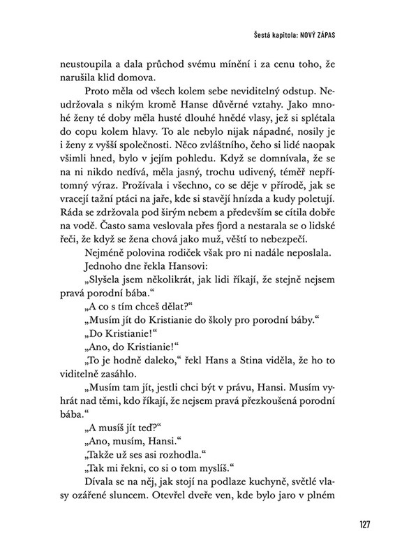 Edvard Hoem zpracoval životní pouť své praprababičky Marty Kristine s obrovskou básnickou intenzitou. Citlivě vypráví o její hluboké lásce k manželu Hansovi, o každodenním životě s jedenácti dětmi a o nesčetných cestách porodní báby přes fjord. Atmosféricky a detailně vykresluje obraz celé doby, krajiny - a zejména profese porodní asistentky před 200 lety. Prostota tohoto života a odvaha a životaschopnost postav jsou pro dnešního čtenáře obzvlášť působivé.