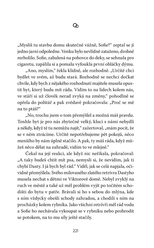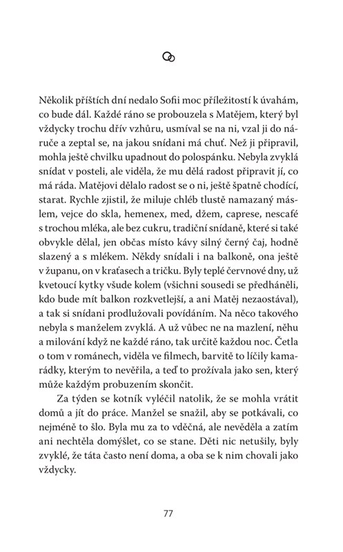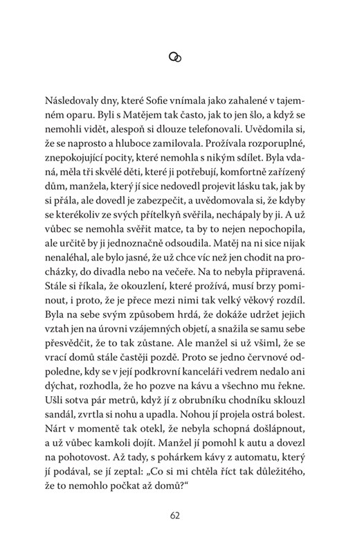 Ani jeden z nich nečekal, že ho pohltí taková vlna emocí. „Usazení“, tak se přece říká lidem jejich věku. Možná měl Matěj potkat Sofii dřív. Změnilo by to ale něco na osudovém vztahu muže o pětadvacet let staršího než jeho partnerka? Na „možná“ se nehraje a náhody neexistují, nezbývá než navzdory okolnostem nepřestávat skládat složitou vztahovou mozaiku, které stále něco chybí k úplnosti. Román o jednom vztahu a mnoha událostech rodinných i společenských, které nás někdy potopí, jindy vynesou nad hladinu.