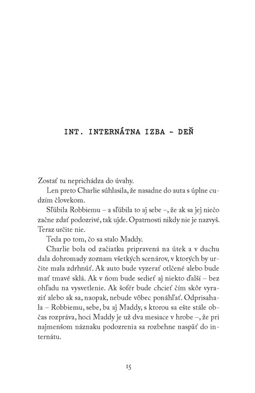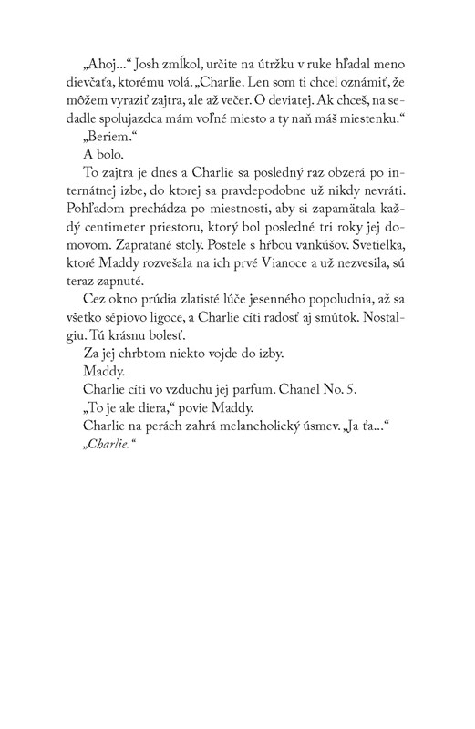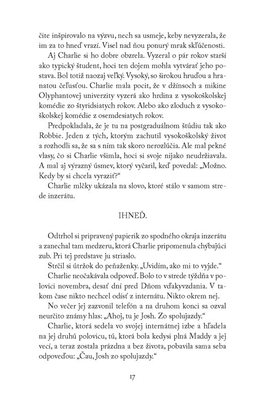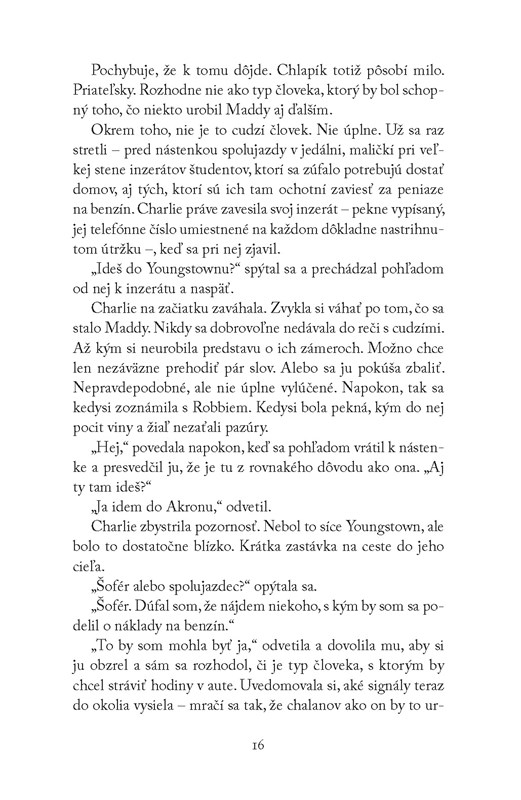 Josh Baxter, muž za volantom, je pre Charlie úplne cudzí. Zoznámili sa len preto, aby sa mohli podeliť o výdavky na dlhú cestu autom do Ohia. Obaja majú svoje dôvody, prečo potrebujú odísť z internátu. Charlie poháňa pocit viny a smútok zo šokujúcej vraždy jej najlepšej priateľky, ktorá sa stala treťou obeťou takzvaného Univerzitného vraha. Josh sa ponáhľa za svojím chorým otcom – alebo to aspoň tvrdí.