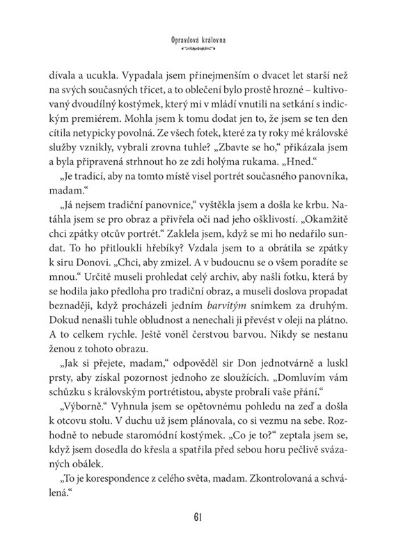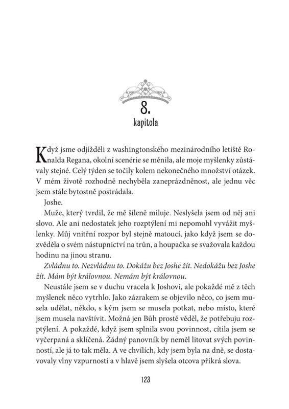 Krásná princezna a hříšně nádherný herec. Milostný románek, který zaručeně otřese britskou monarchií… a vlastně i celým světem. Dívka s modrou krví Adeline a hollywoodský idol Josh Jameson dobře věděli, že jakákoliv jejich společná budoucnost je nemožná. Ona je princezna, která musí ctít protokol, on je slavná celebrita, kterou na každém kroku pronásledují davy nadšených fanynek. Spalující vášeň, která mezi nimi náhle vzplála, se však brzy přetavila v silný vztah. Fyzické se stalo emocionálním. Jejich srdce se propletla stejně dokonale jako jejich těla. Do nádherné lásky však zasáhne krutý osud – Adeline se má stát po tragické události v rodině královnou, to ovšem znamená nechat se spoutat těžkými okovy povinností a poslouchat armádu rádců, kteří udělají vše pro to, aby Joshe udrželi od Jejího veličenstva co nejdále...