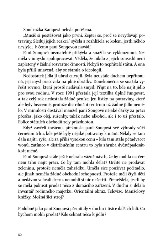 Demicková věnovala pečlivé rekonstrukci života v Čchongdžinu, městě zapovězeném cizincům, šest let. Jako zdroj informací jí sloužily rozhovory s uprchlíky, propašované fotografie a videonahrávky. Kniha popisuje chaos, který nastal po smrti Kim Ir-sena, suverénní nástup jeho syna Kim Čong-ila, zničující hladomor, v jehož důsledku zemřela odhadem desetina populace, i vlnu následných ilegálních útěků ze země.
