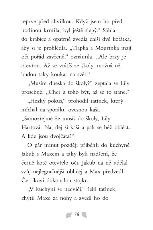 Maminka malé Lily přinese domů tři slabá koťátka, která se našla opuštěná venku pod keřem. Kočičí miminka potřebují hlídat a pravidelně krmit. Celá rodina, včetně fenky Meg, si malé chlupáče ihned zamiluje. Lily se snaží co nejvíce pomáhat a o mláďátka pečovat. Podaří se koťátka zachránit, nahradit jim maminku a najít nový domov?