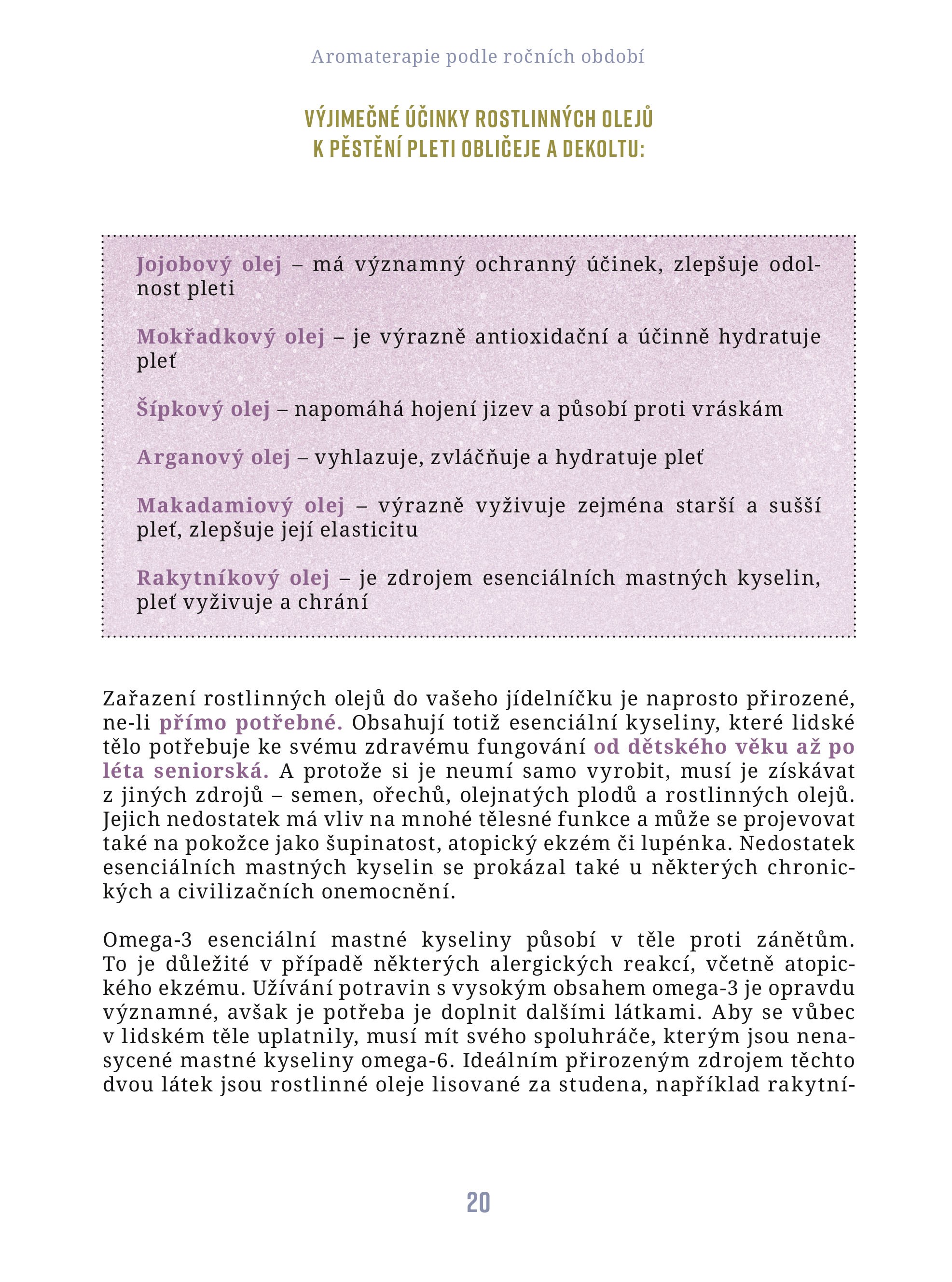 Z tisíce okvětních lístků získáme jednu kapku vzácného oleje. Éterické oleje zachycují něco jedinečného, co zasahuje naše smysly na mnoha úrovních. Harmonizují emoce, posilují intuici a zlepšují zdraví. Éterické oleje ovlivňují tělo i psychiku, a jsou proto velmi účinnými pomocníky v péči o celkové zdraví. Vydejte se na svou voňavou cestu, naučte se, kdy oleje využívat, jak je míchat i podle čeho vybírat.